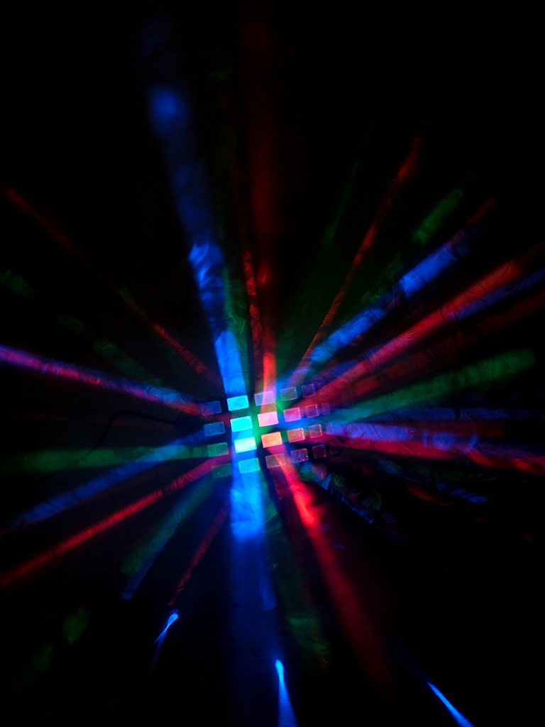 Musikgetakteter LED Strahleneffekt. Wirft bunte Lichtstrahlern durch den Raum die sich mit dem Bass der Musik automatisch ändern