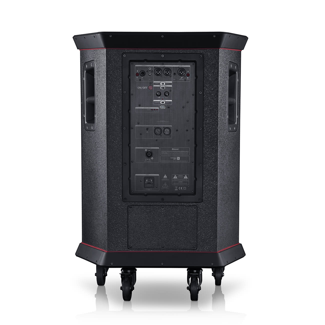 integriertes 2-Kanal Mischpult, Anschlüsse für Mikrofon (XLR), Gitarre und Mini-Klinke.